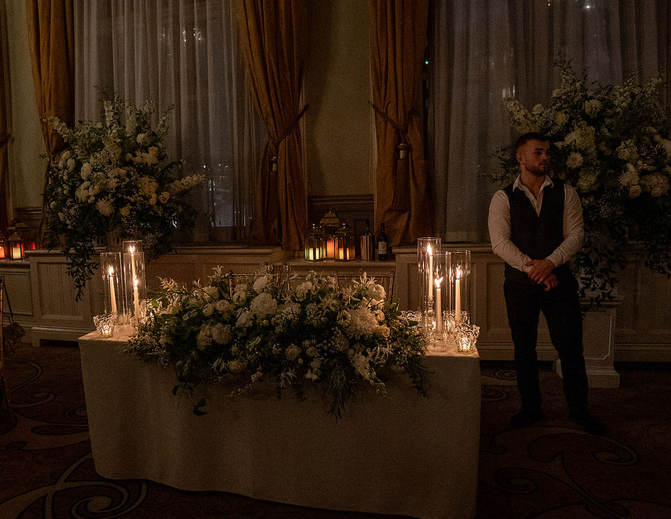 On their wedding day, the hanging garden top table became a stunning focal point, transforming the expansive ballroom