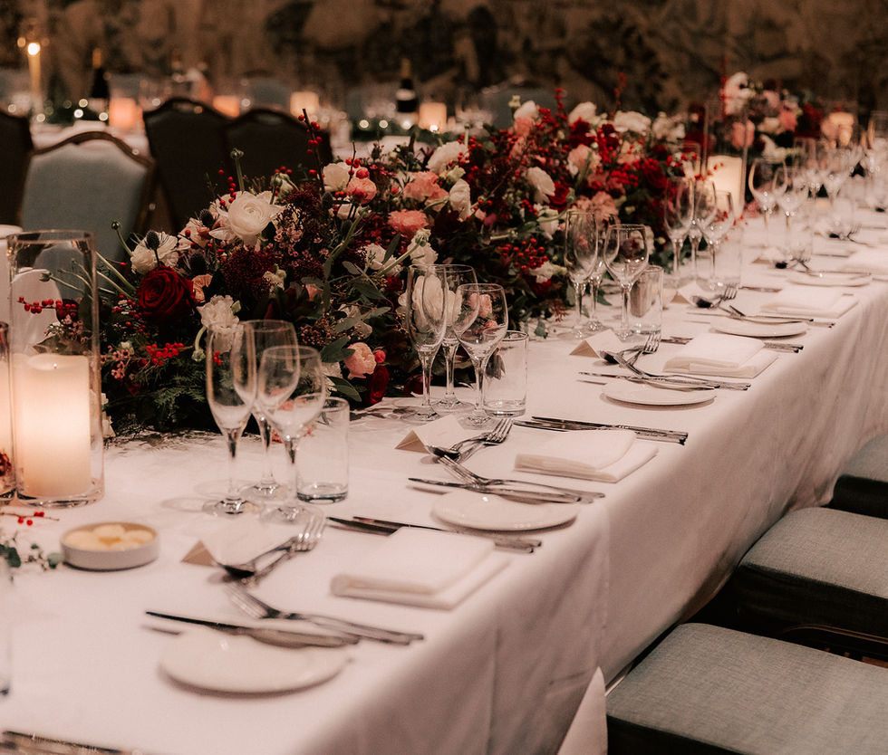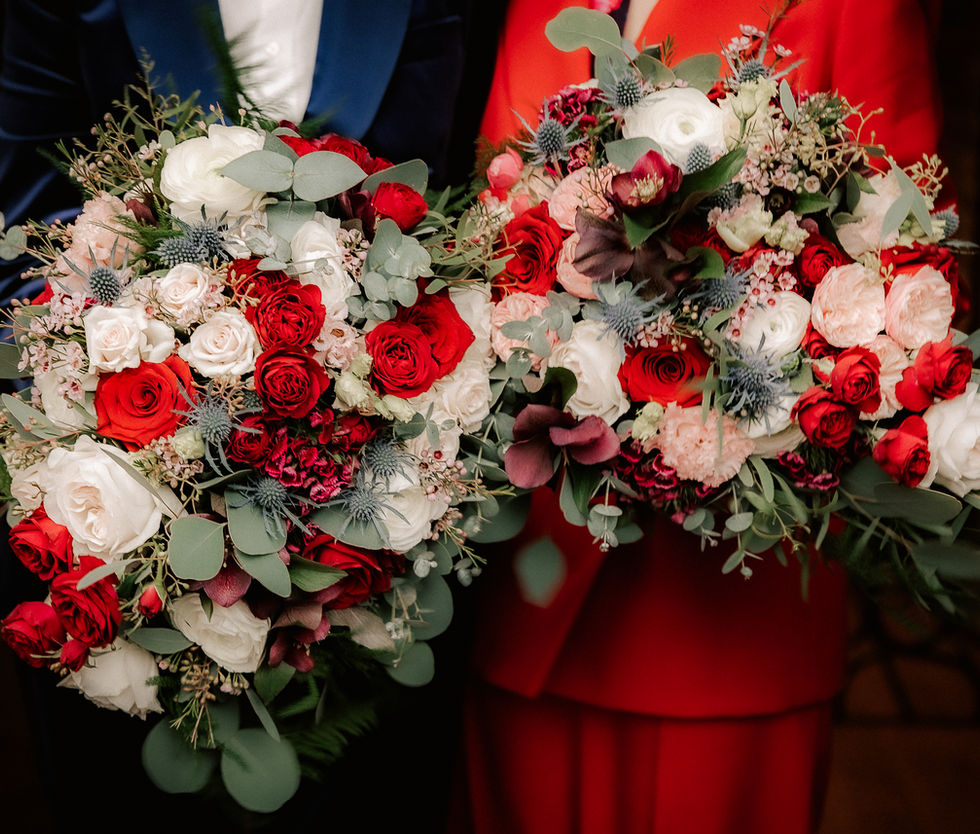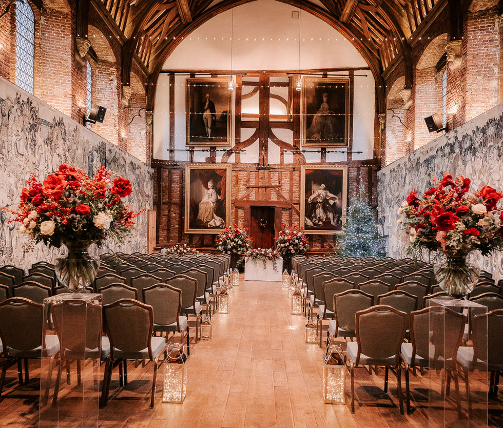 This beautiful venue, rich in history, dates back to 1607. We incorporated red amaryllis and Christmas flowers in burgundy and blush, accented with hints of blue to complement the tapestry walls.