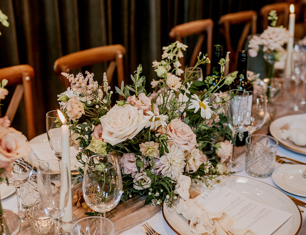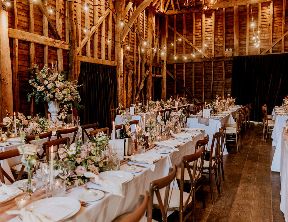 We designed a tablescape featuring a mix of crystal bud vases at varying heights, toffee-coloured candles, and wild floral arrangements, while garden-style blooms adorned the fairy-lit barn, creating a truly enchanting wedding day.